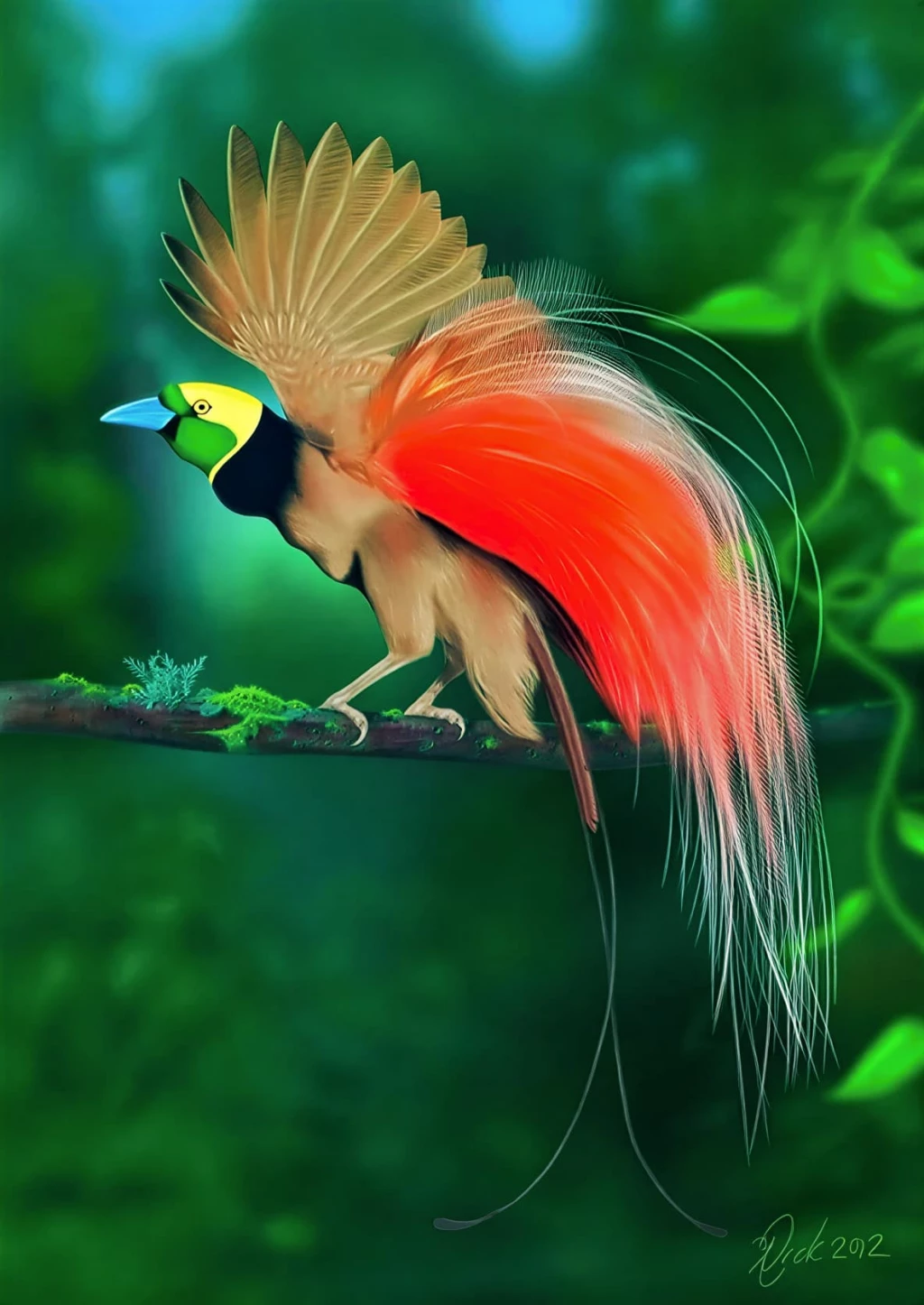 Фонтаны нежных перьев, вырывающиеся из-под крыльев, плавно переходят в ажурные каскады. Тонкие черные проволочки покачиваются, увенчанные металлическими спиралями. Полосы синей кожи чередуются с бархатистыми дорожками. С головы свисают гирлянды из атласных флажков, а на груди переливаются радужные щитки в форме полумесяца.