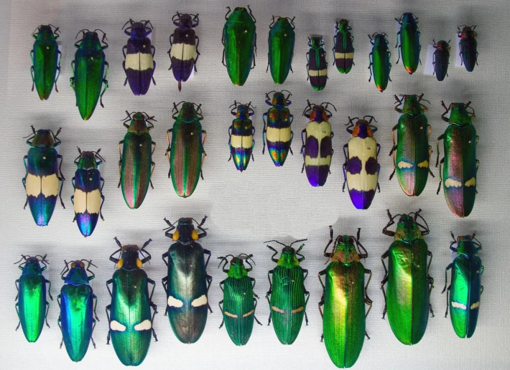 В ход шли не только птицы, но и насекомые. Огромным спросом пользовались жуки-златки. Они обитают в тропиках Юго-Восточной Азии. В Индии их яркие надкрылья веками применяли для создания украшений и декора.