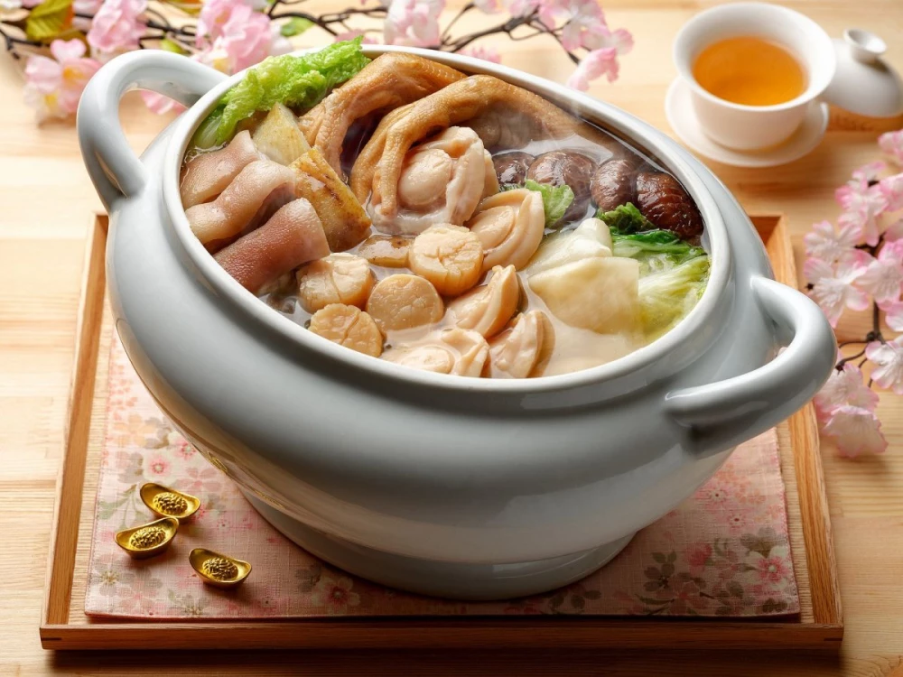 «Будда прыгает через стену» - сложный и дорогой суп из морепродуктов, мяса, грибов и кореньев.