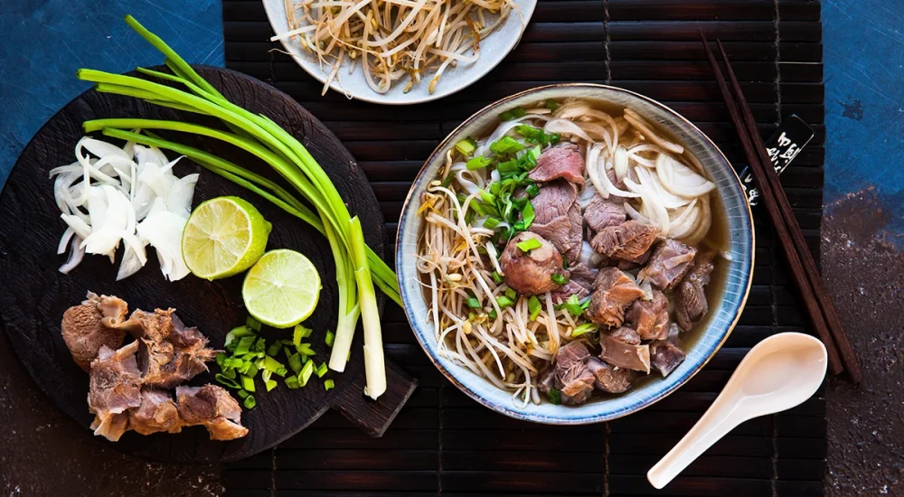 Готовят его долго — до восьми часов томят кости, чтобы бульон стал кристально прозрачным и насыщенным. Подавать фо — целая церемония: свежая зелень, лайм, перец, ростки фасоли, чили.