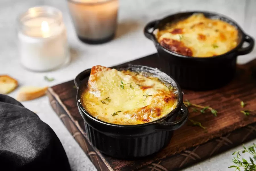 Когда-то Soupe à l'oignon был блюдом бедняков: лук, хлеб и немного вина. Сегодня — это настоящий символ французской кухни. Лук медленно обжаривают до сладости, добавляют говяжий бульон, каплю коньяка и подают под корочкой расплавленного сыра.