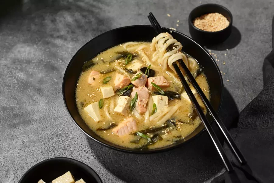 Если борщ — это праздник, то мисо — утренний шёпот. Ничего лишнего: прозрачный бульон, кусочки тофу, зелёный лук и аромат пасты мисо.