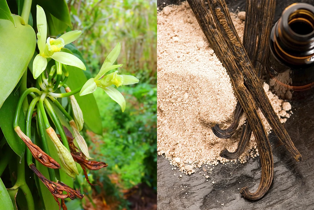 Ваниль относится к семейству орхидных — только взгляните, как красиво она цветет! Чтобы приготовить специю, незрелые плоды погружают в кипяток, а затем сушат до появления белого налета. Готовые стручки нарезают на части либо вскрывают, чтобы извлечь ванильную пасту, состоящую из мелких семян.