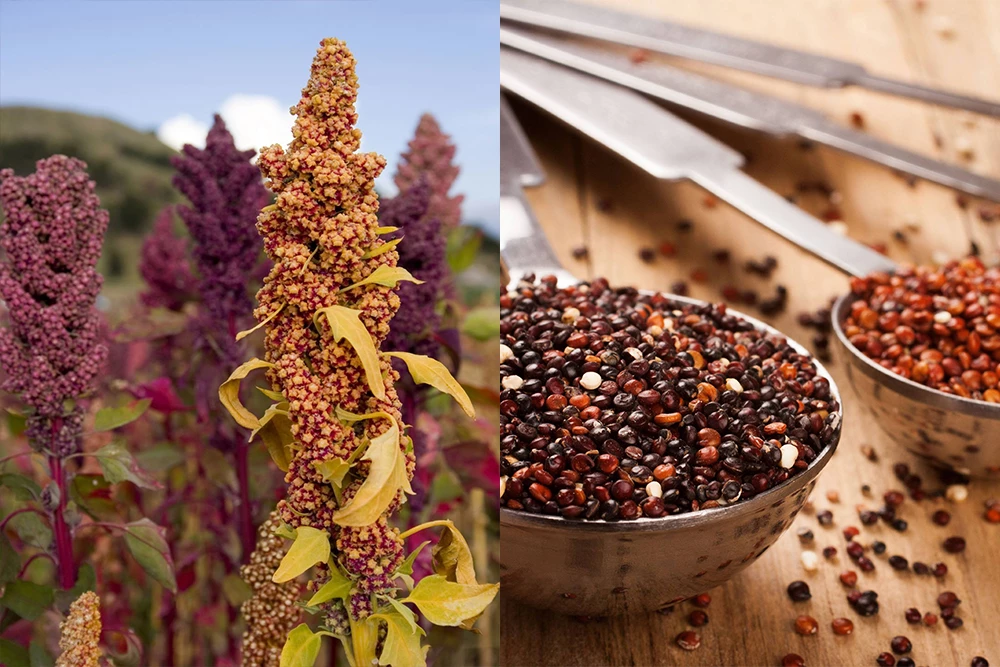 Киноа быстро стала модным суперфудом, но мало кто видел, как она растет. Псевдокрупа, собранная в грозди, созревает на таких вот цветных стеблях. Собранный урожай ученые называют фруктами, поскольку киноа относится к псевдозерновым культурам.