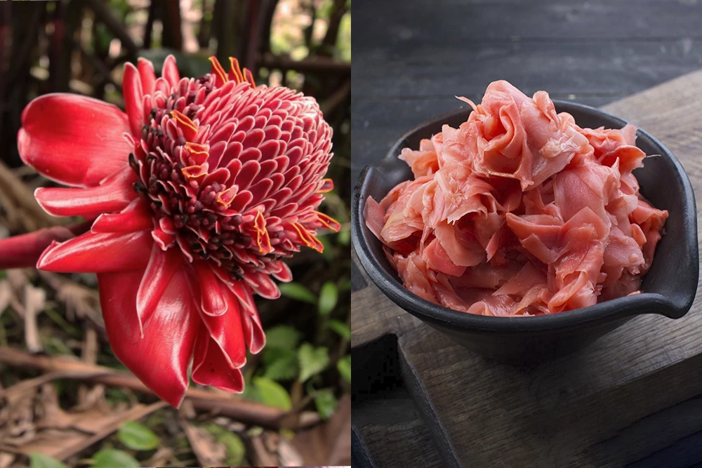 Ну и напоследок вспомним про имбирь. Глядя на его розовый цветок, может показаться, что маринованный имбирь, который подают в ресторанах японской кухни, сделан из его лепестков. Однако это заблуждение: цветение у растения — явление довольно редкое, а в пищу мы употребляем корень.