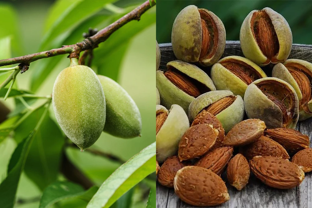 Миндальное дерево — кустарник, способный вырасти до 10 метров в высоту. После цветения на каждой веточке формируется несколько плодов, по форме напоминающих яйцо. Когда плоды созревают, оболочка лопается, оголяя косточку. Дальше урожай собирают, счищают с него околоплодники, а орехи сушат и раскалывают.