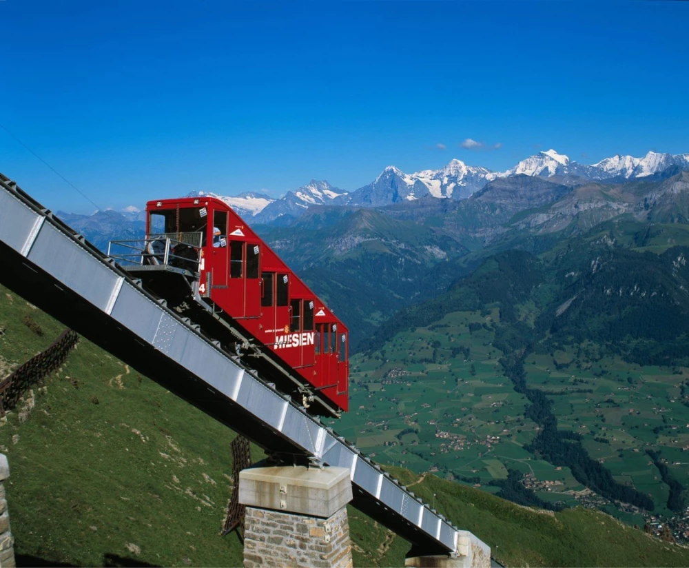 Красный вагончик преодолевает 2112 метров в окружении роскошных альпийских пейзажей. Маршрут протянулся от деревни Меленен к вершине горы Низен.