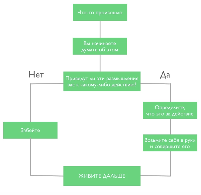 Такая концепция может показаться апатичной. На самом деле это не так. Это просто отказ от пустой траты своей энергии и времени на мысли, которые ни к чему не приведут. Так что если вы решили над чем-то запариться, убедитесь, что это приведет к какой-то ответной реакции на то, что произошло, и затем переходите к действию. Вот наглядная схема действий.