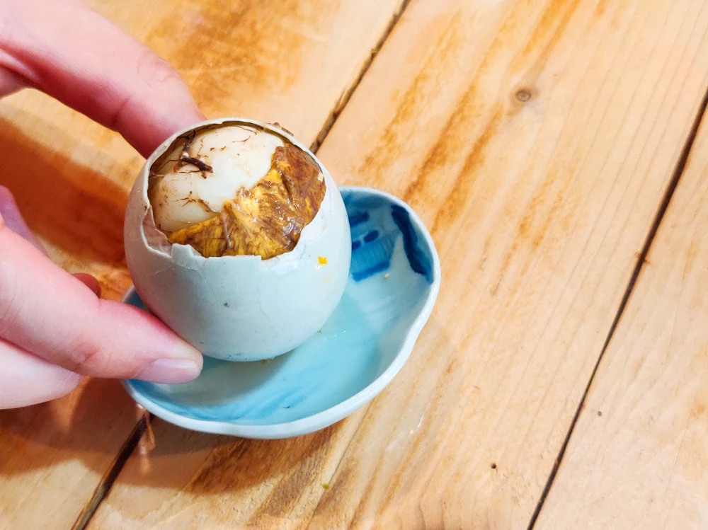 По прошествии некоторого времени (обычно 3-4 месяца) белок становится упругим, полупрозрачным и тёмно-коричневого цвета. А желток темнеет и приобретает кремообразную структуру. Яйцо обладает сильным аммиачным запахом.