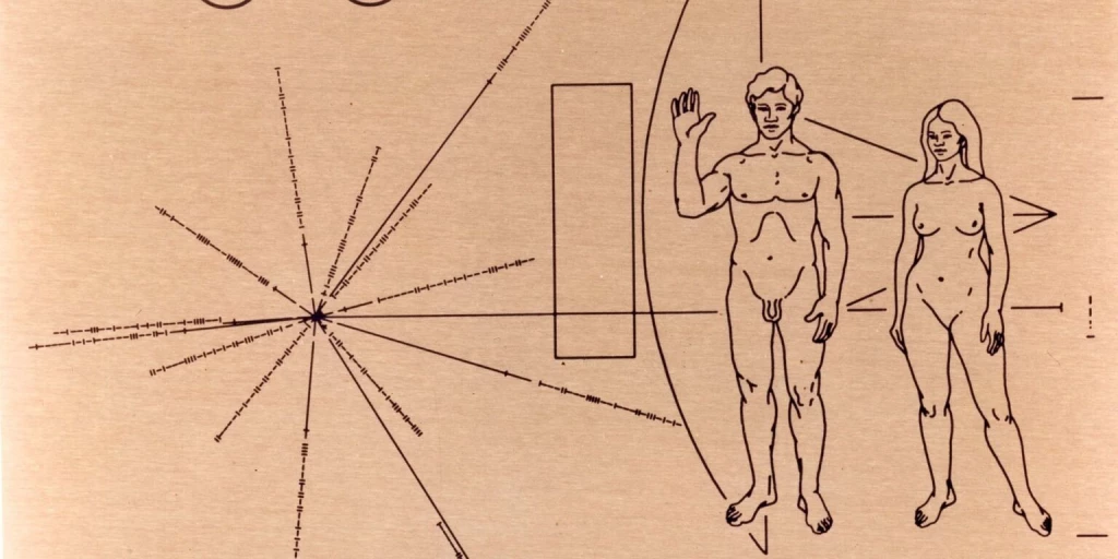 Космические зонды NASA «Пионер-10» и «Пионер-11» запустили к Юпитеру и Сатурну в 1972–1973 годах. На случай, если однажды на них наткнутся внеземные цивилизации, астрономы Фрэнк Дональд, Карл Саган и его жена художница Линда Саган придумали сообщение, которое выгравировали на алюминиевых пластинах и закрепили на борту.