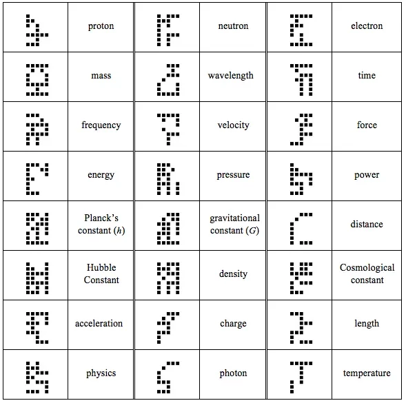В этой последовательности из 1679 двоичных чисел Саган и Дрейк зашифровали самую важную, на их взгляд, информацию о нашей планете. Это были числа от 1 до 10, формулы некоторых химических элементов и нуклеотидов ДНК, сведения о человеке и Солнечной системе и о радиотелескопе в Аресибо.