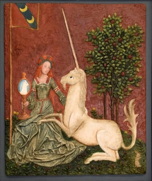 Этот мотив впервые появился в физиологах — средневековых аллегорических трактатах о животных. В «Физиологе» II–III вв. девственница символизировала Деву Марию, а единорог — Христа, «пойманного любовью». Эта христианская аллегория стала краеугольным камнем европейского образа единорога.