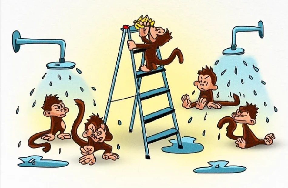 Потом учёные заменили последнюю обезьяну. Да, ей тоже не позволили забраться на лестницу за бананами. Но вот в чём загвоздка: в клетке не осталось ни одной обезьяны, которую поливали холодным душем.